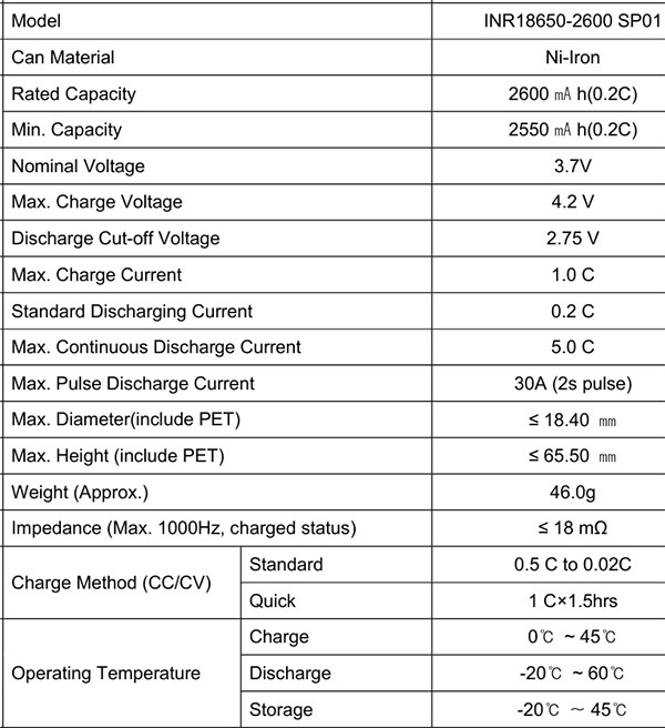 ¡Þ Max. Charge Current : 1.0C (2.6Ah)